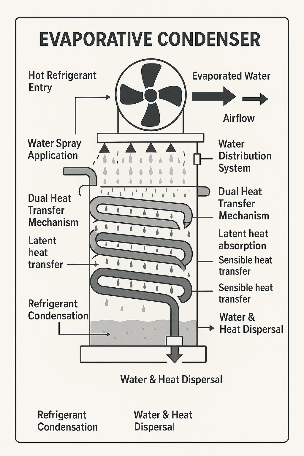 Os condensadores evaporativos rejeitam o calor combinando o resfriamento do ar com a evaporação da água. Ao contrário dos condensadores padrão que dependem apenas da transferência de calor sensível, eles aproveitam a absorção de calor latente durante a evaporação da água.
