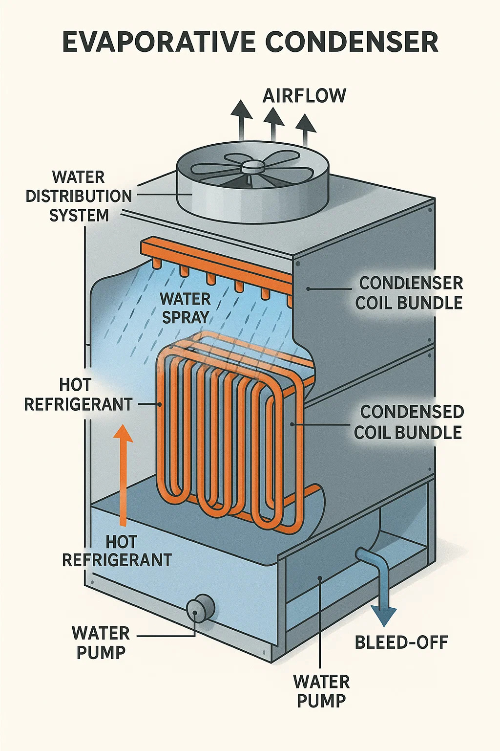 Um condensador evaporativo integra resfriamento de ar e evaporação de água para rejeitar o calor dos sistemas de refrigeração. Seu projeto e operação diferem fundamentalmente dos condensadores resfriados a ar padrão: