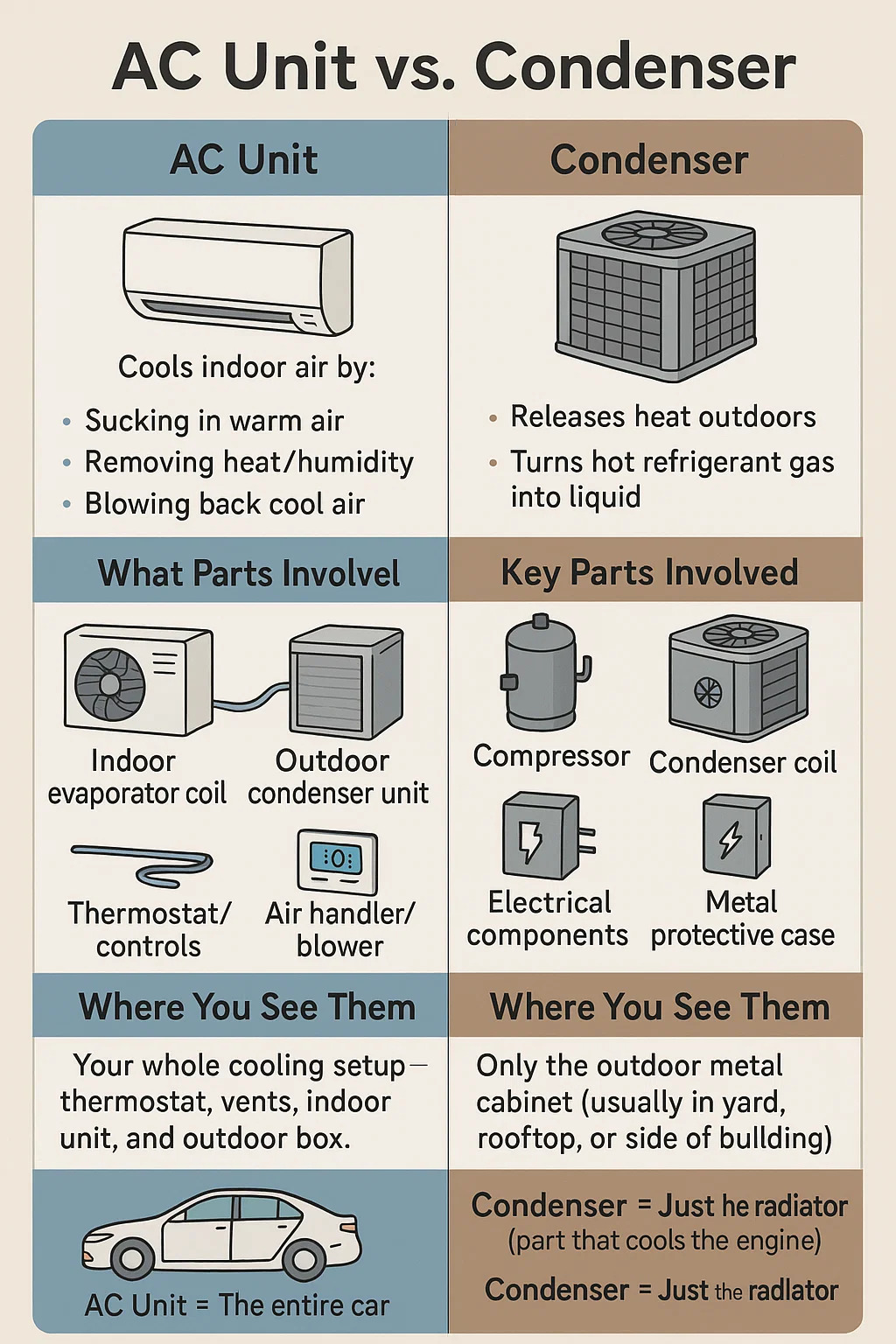 Condensador: Apenas uma parte da unidade AC – especificamente, a caixa de metal externa que libera calor.